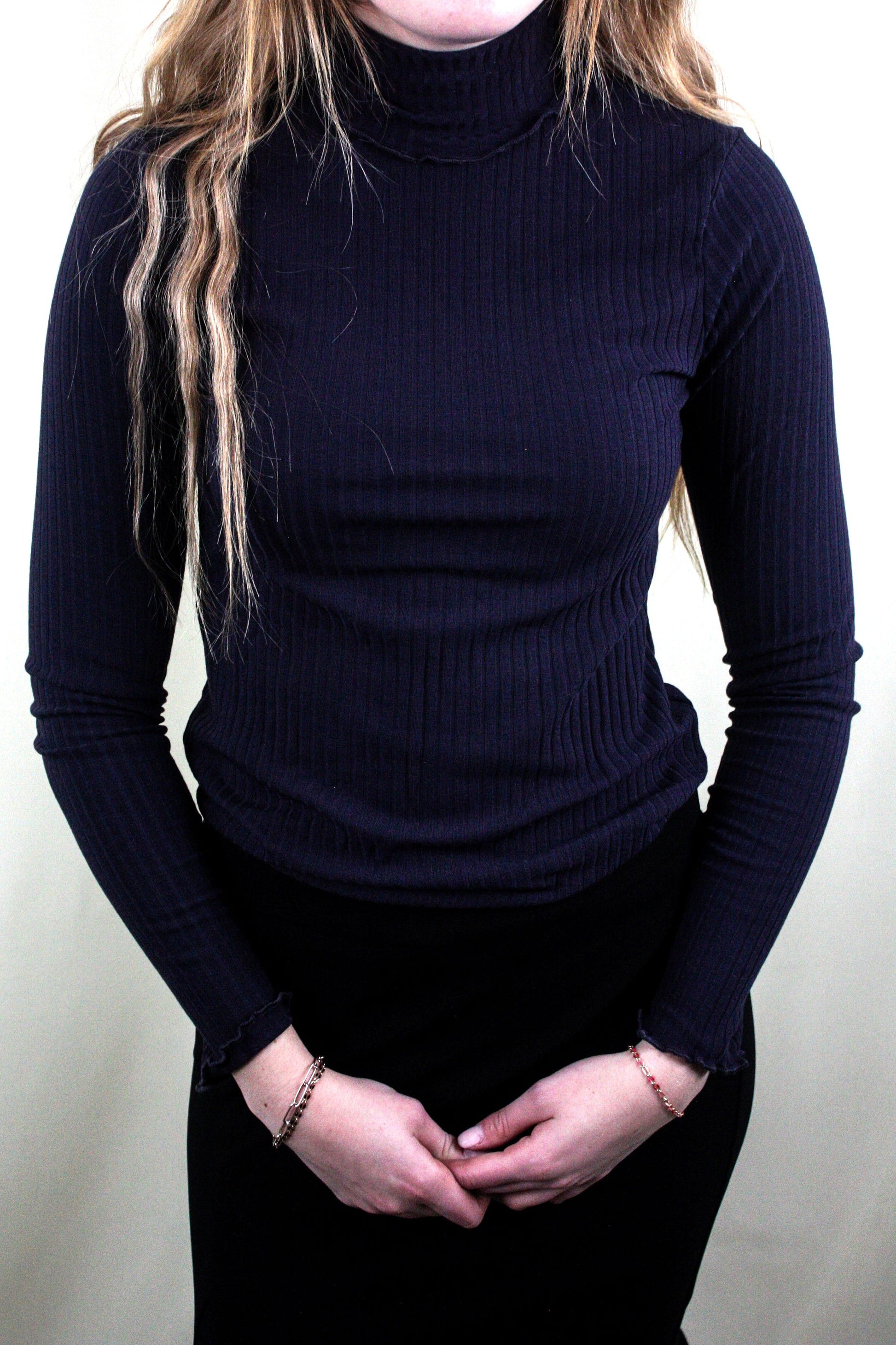 Elevate your everyday style with this navy ribbed mock neck top. The playful lettuce hem detailing adds a feminine touch to this versatile wardrobe essential. Soft and breathable, it pairs beautifully with skirts or your favorite denim.