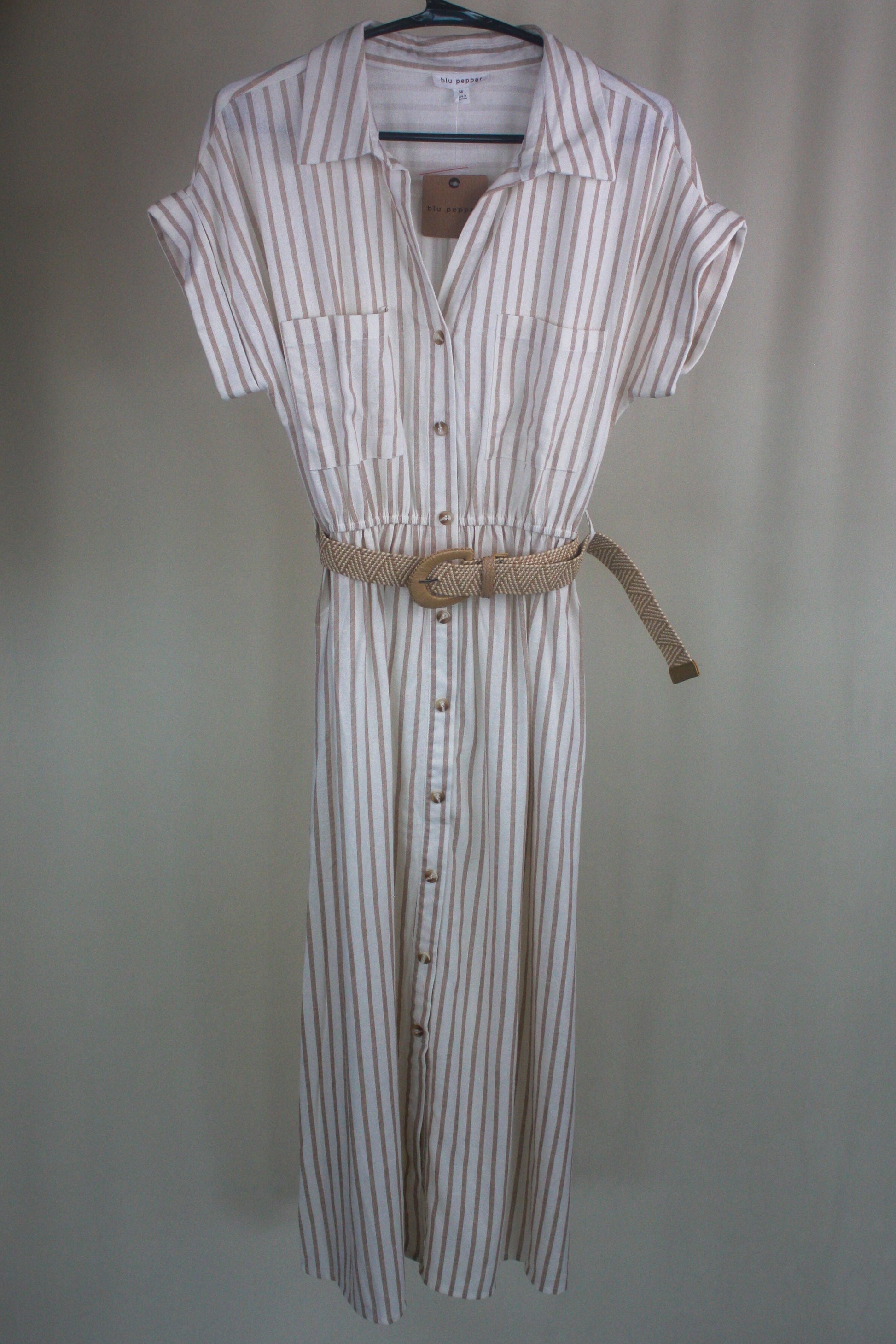 Polished yet relaxed, this striped belted midi shirt dress strikes the perfect balance between effortless and put-together. The included belt cinches the waist for a flattering silhouette, while the breathable rayon-linen blend keeps you cool all day.
